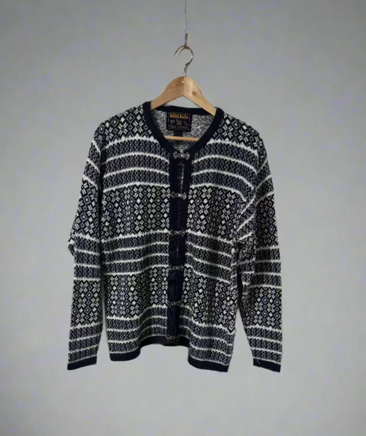 Vintage Woolrich navy and white fair isle pattern cardigan with Austrian style silver clasps down the front.