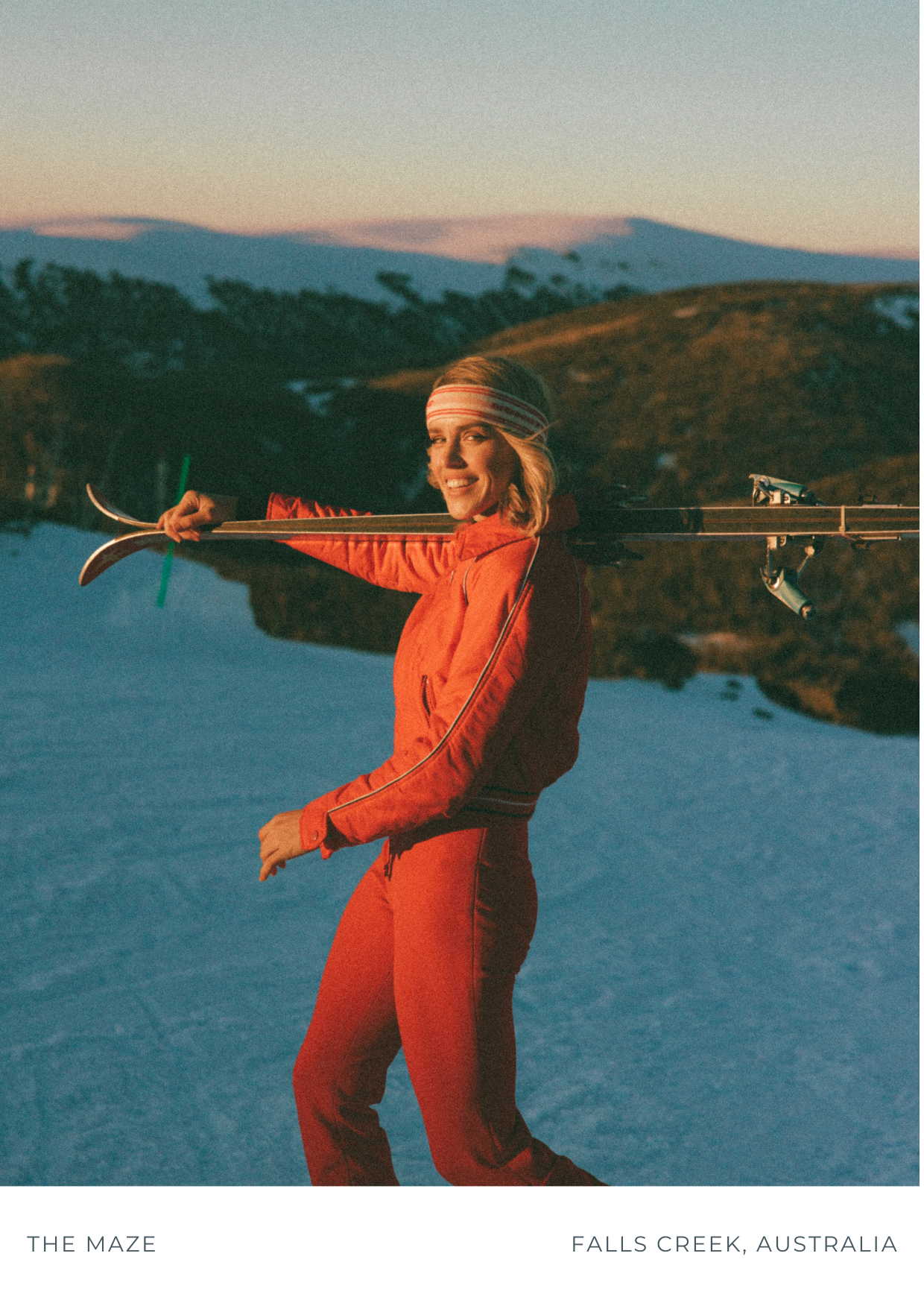 This retro Falls Creek post card imitates the ski advertising posters of the 1970's and '80's. This image features a person dressed in red and walking with a pair of skis on their shoulders, with views of Mt Bogong at dusk in the background. The person is dressed in authentic vintage ski clothing and accessories.