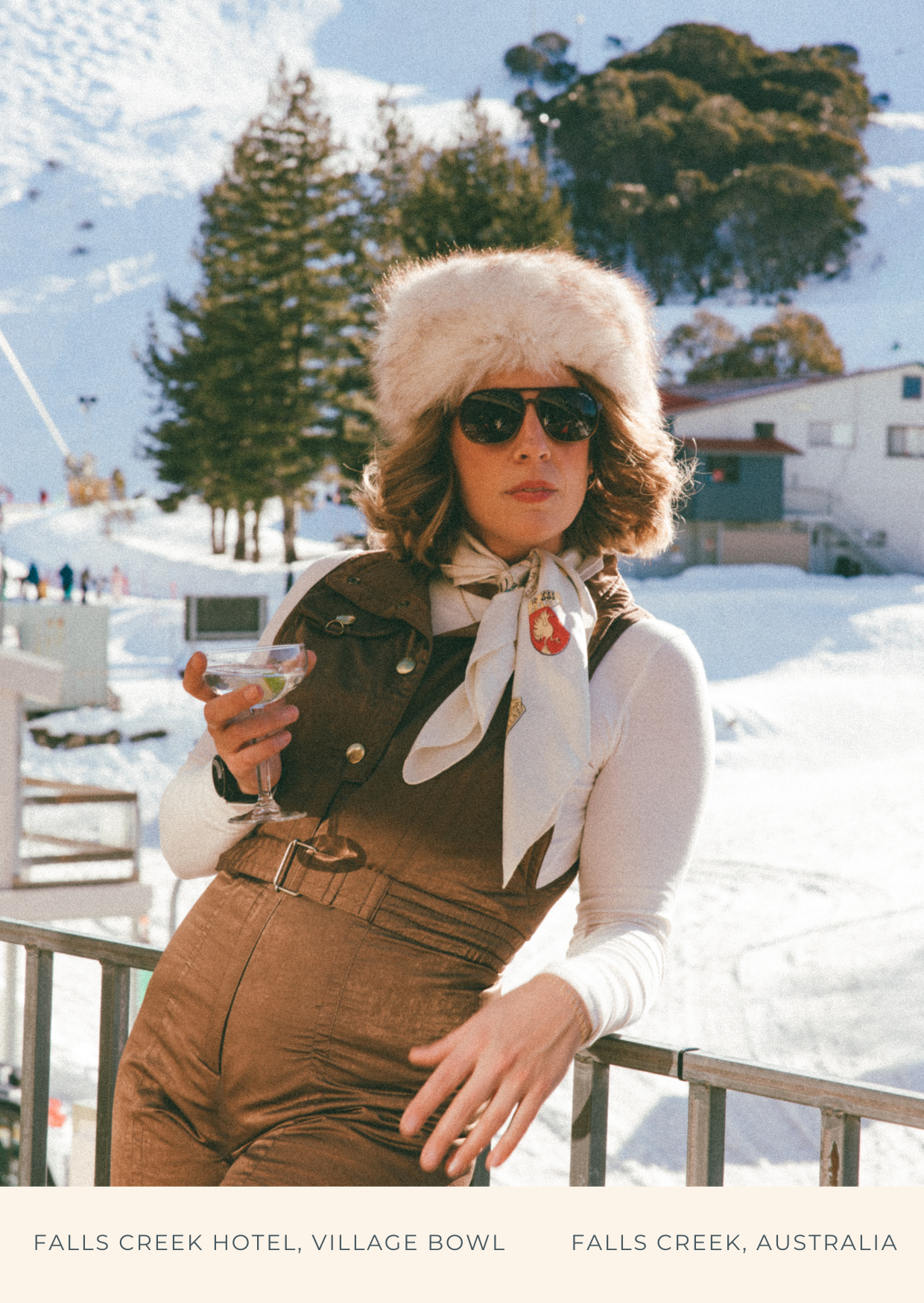 This retro Falls Creek post card imitates the ski advertising posters of the 1970's and '80's. This image features a person holding a drink on the balcony of the Falls Creek Hotel, with the Summit in the background. The person is dressed in authentic vintage ski clothing and accessories.